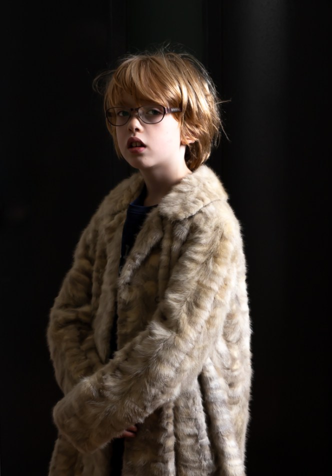 Sam, my 8-year old, wearing his great grandmothers fur coat and glasses, 2020